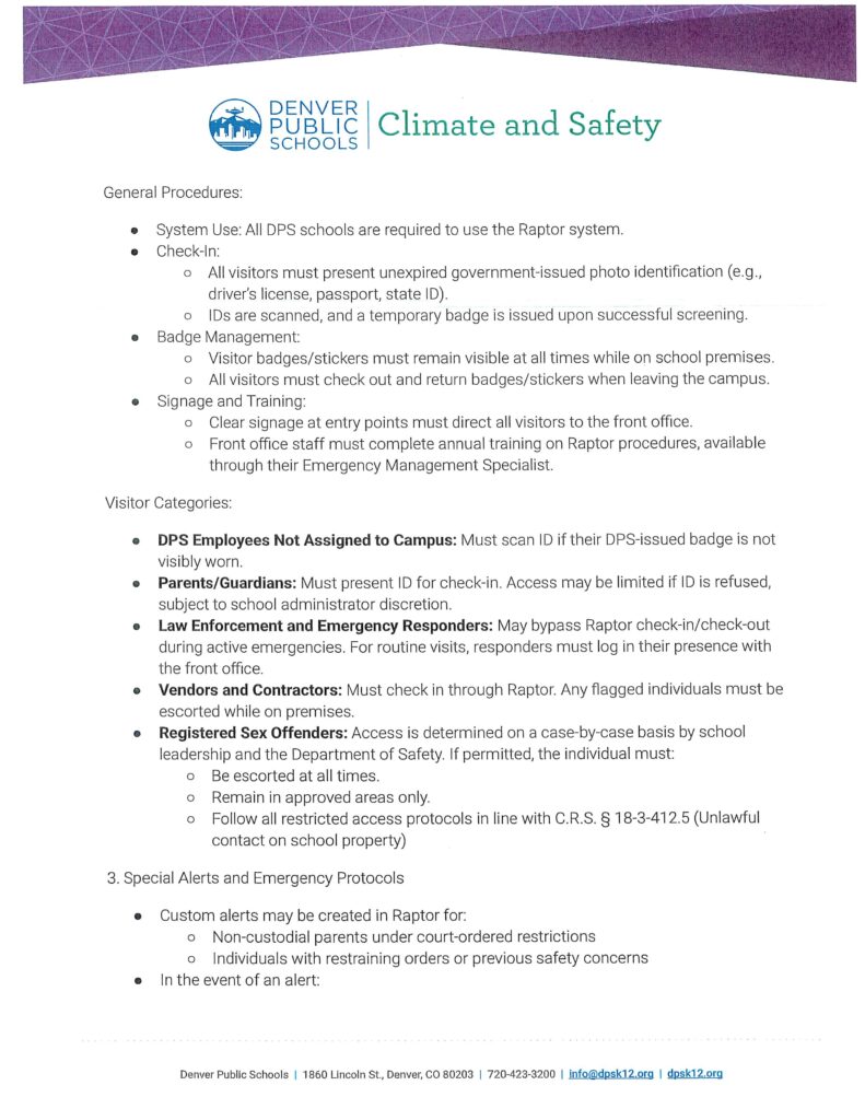 All visitors, including DPS employees who are visiting a school where they are not assigned, must be checked in by the Raptor Visitor Management System. You must always bring an ID for us to scan into the system, or we cannot let you go beyond the front office.